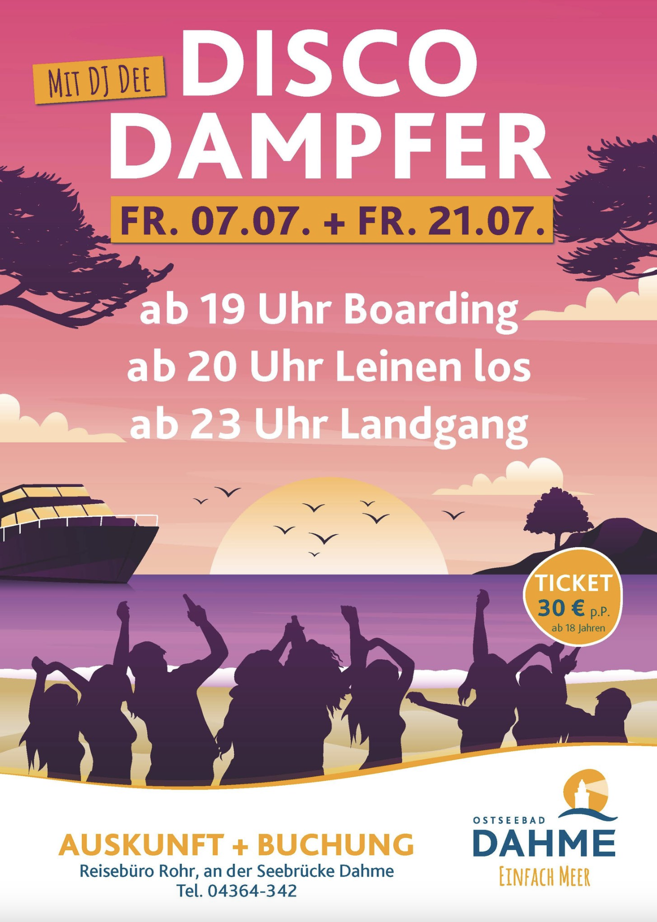 Um 20.00 Uhr wurde abgelegt Richtung Fehmarn. Das Wetter spielte hervorragend mit und die Stimmung war erstklassig. Die ersten fingen gleich an zu tanzen was bis zum Schoß anhielt. Um 23.00 Uhr legte das Boot wieder in Dahme an und die Gäste verließen das Boot mit einer Polonäse.